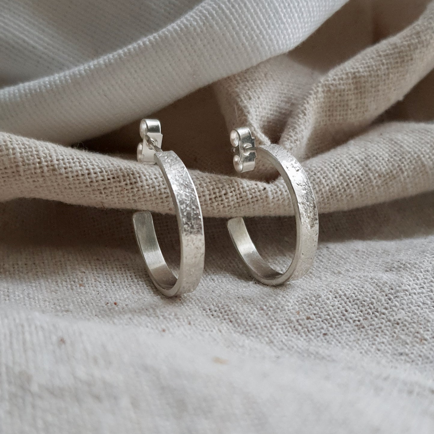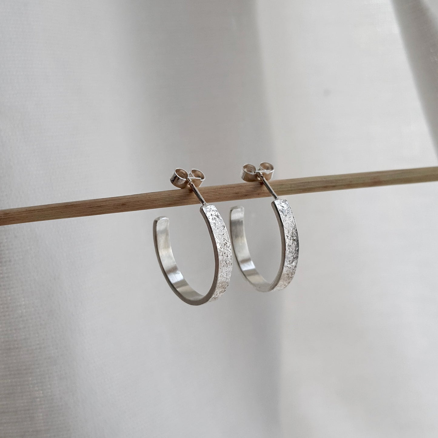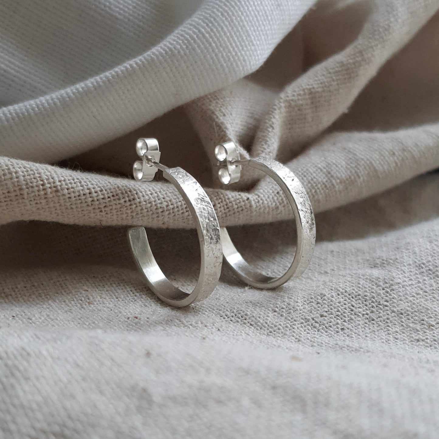 The Sandy Silver Hoops are the perfect pair of earrings for understated glamour. They are simple and stylish, and the texture on them has a beautiful organic feel to it.