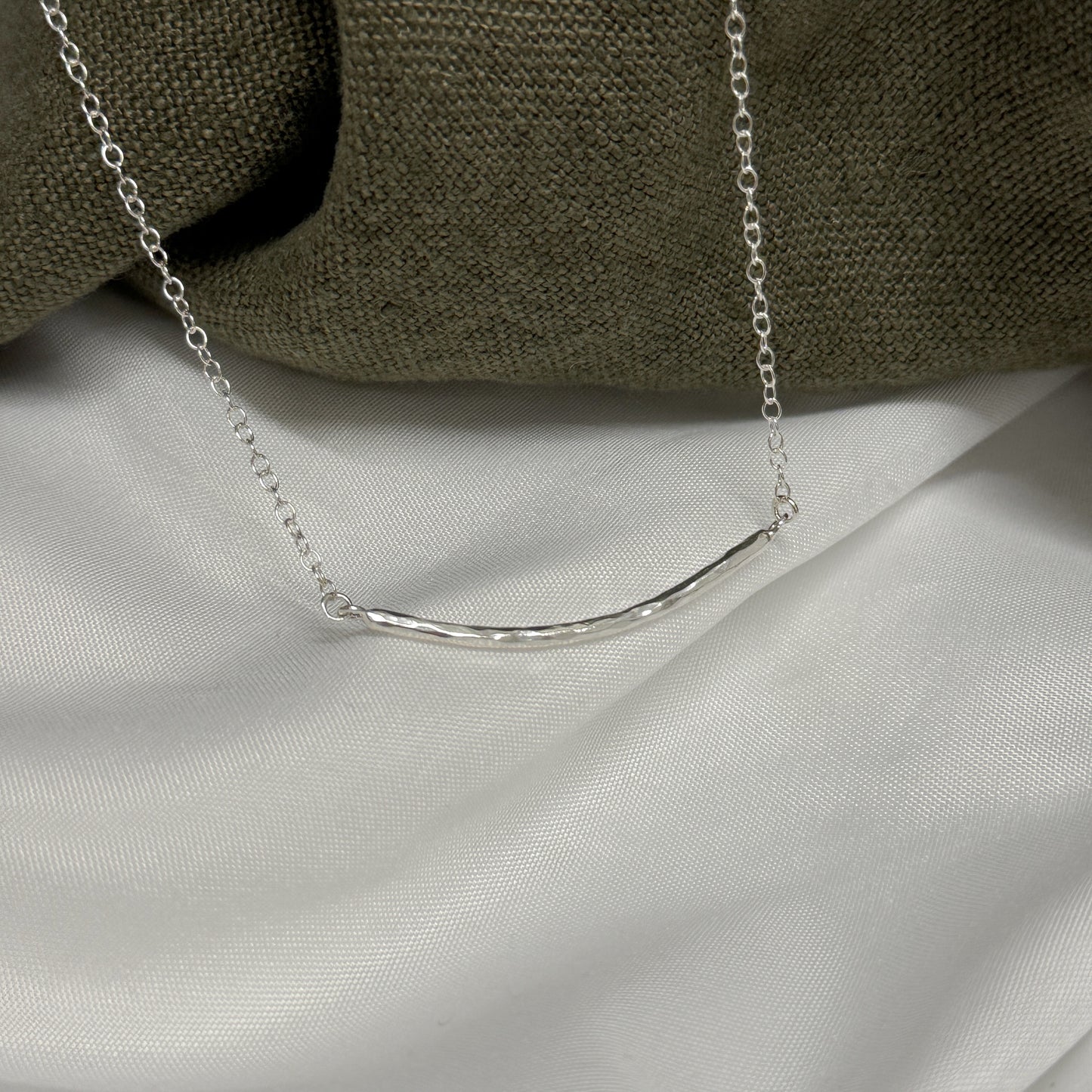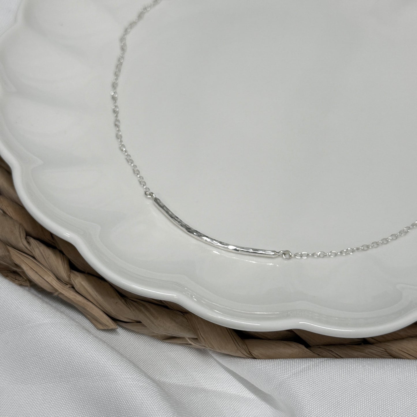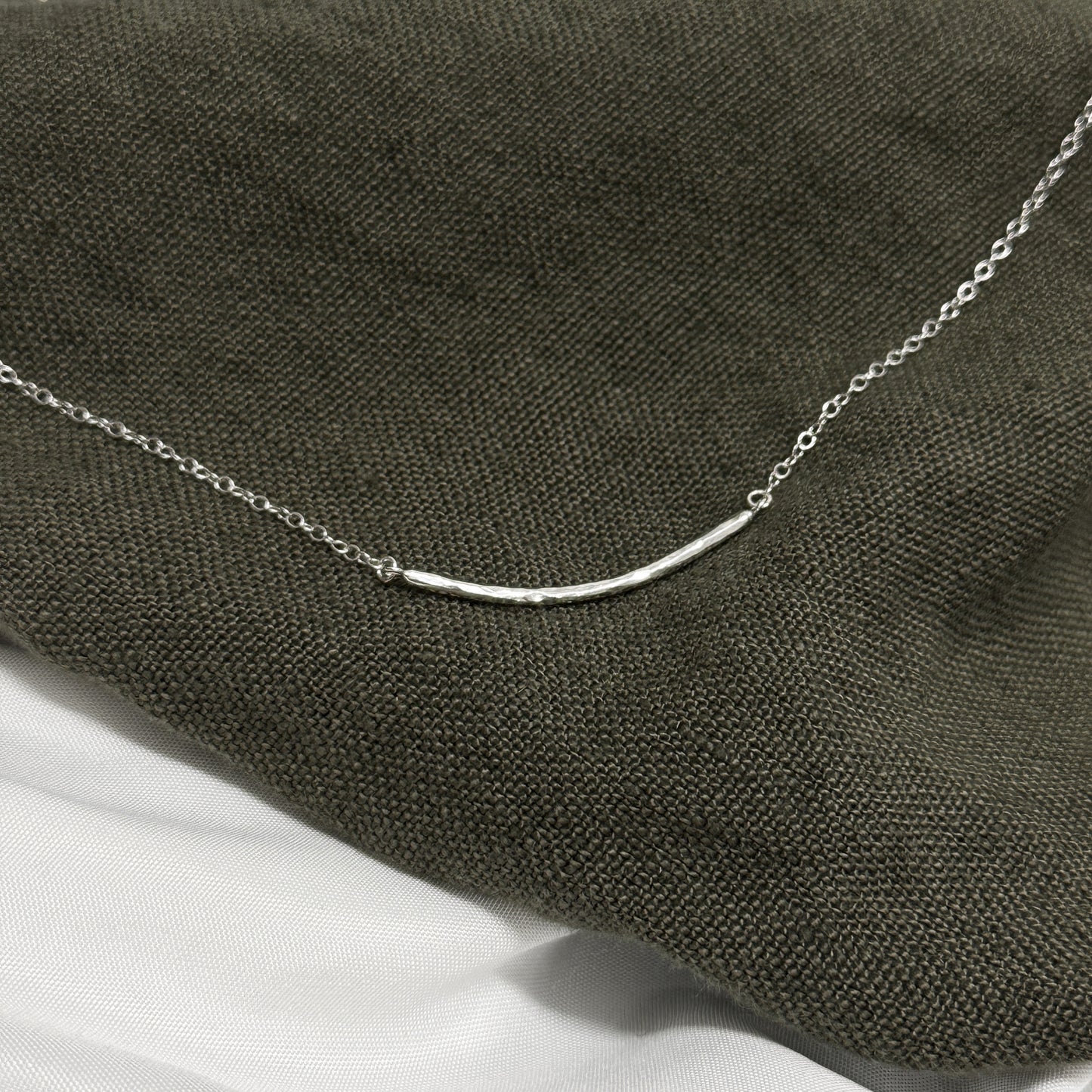 The bar has been hammered, so it almost shimmers in the light. The understated and elegant design of the Silver Mini Bar Necklace is perfect for adding the finishing touch to your outfit.