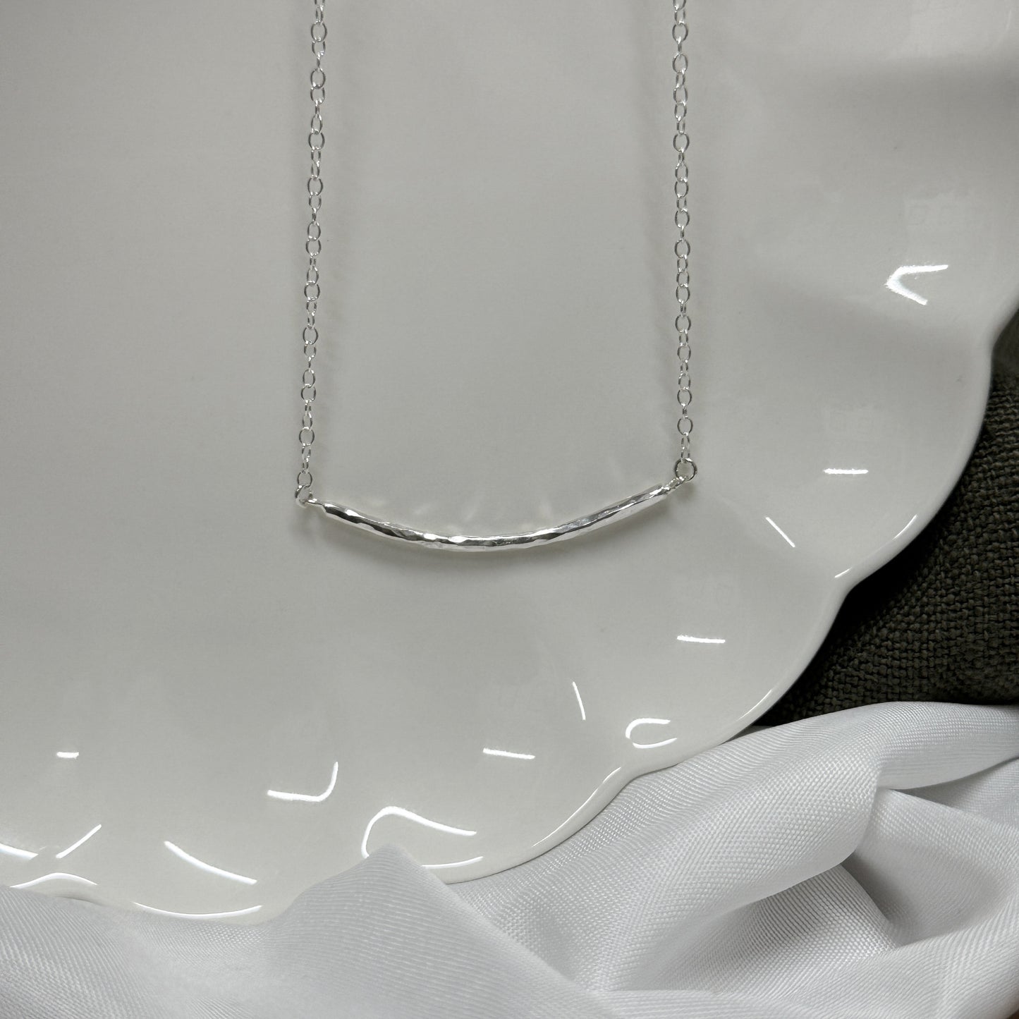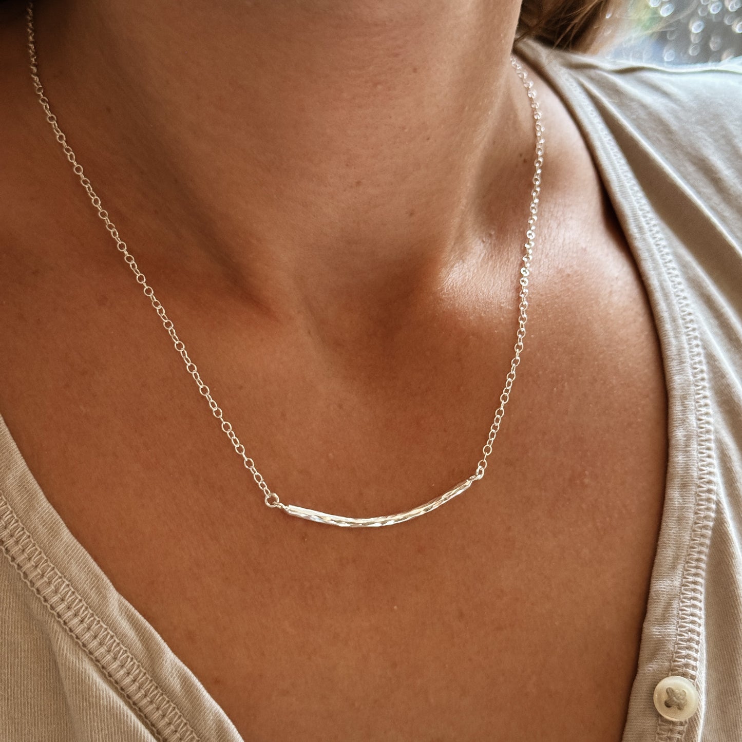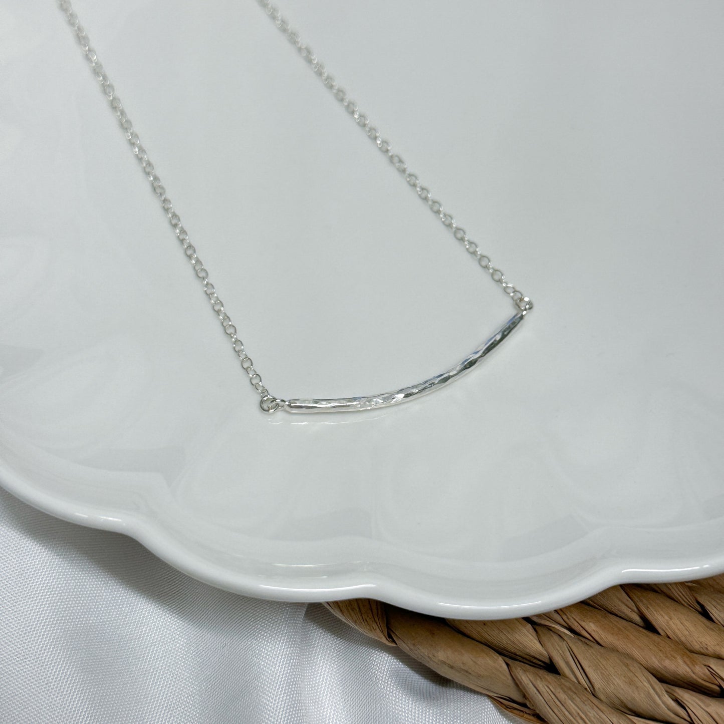 The bar has been hammered, so it almost shimmers in the light. The understated and elegant design of the Silver Mini Bar Necklace is perfect for adding the finishing touch to your outfit.