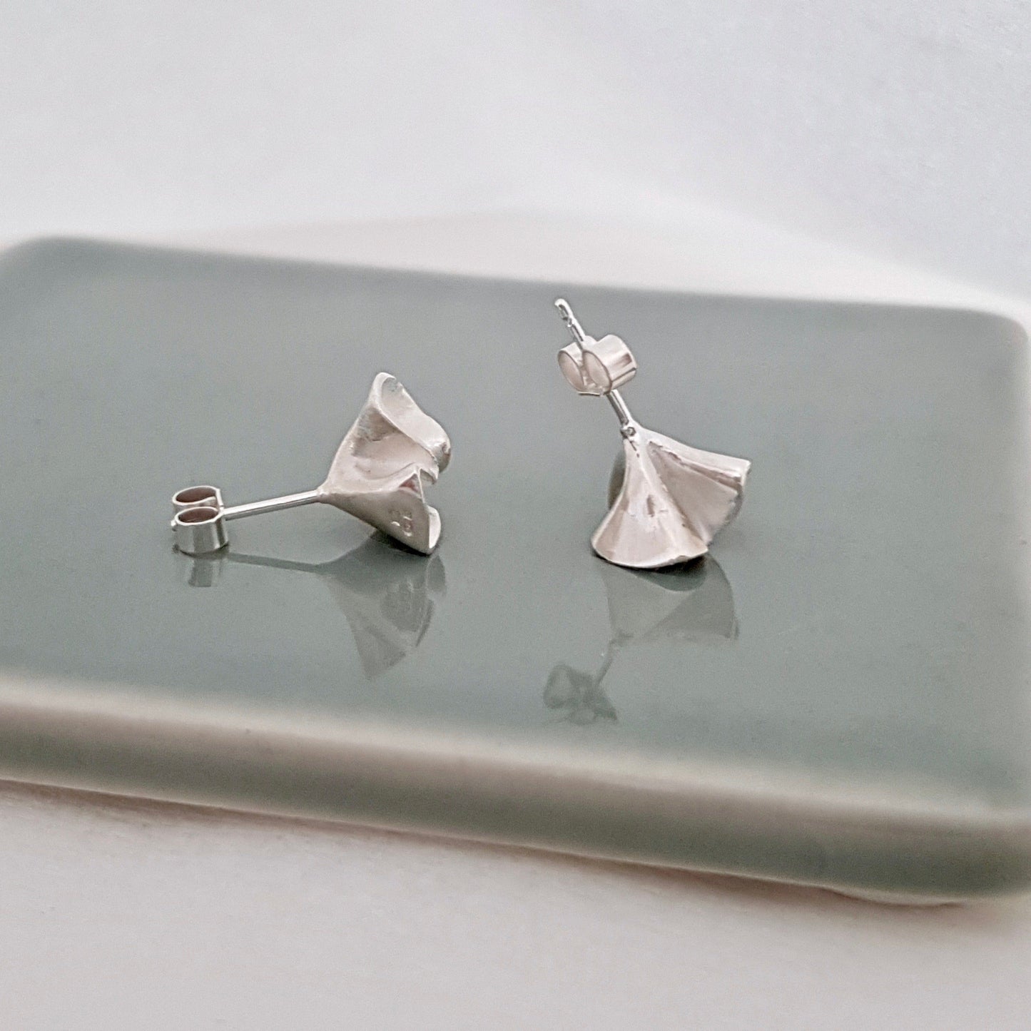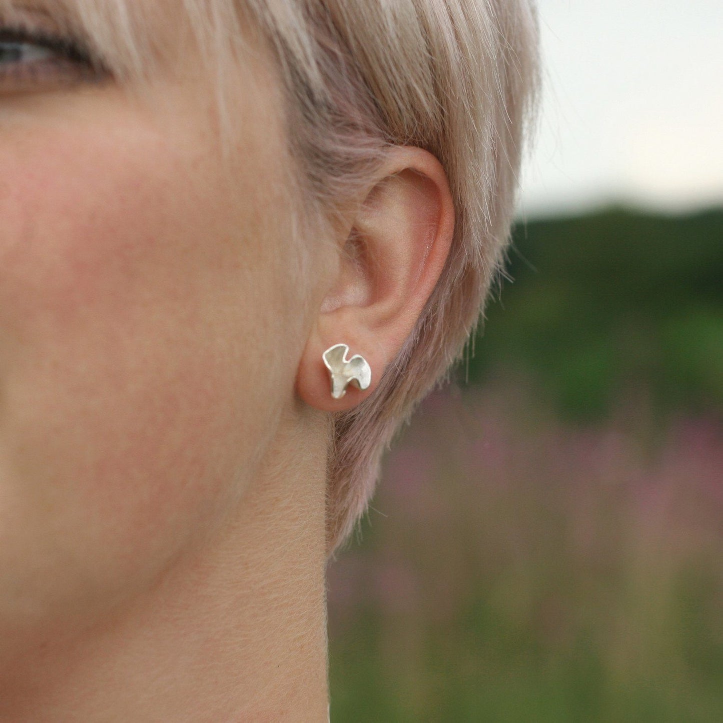 The earrings unique organic shape adds a hint of softness and charm. The gentle curves of the blossom flower have a soft white centre and a highly polished edge that catches the light just enough to add a slight twinkle.